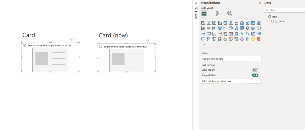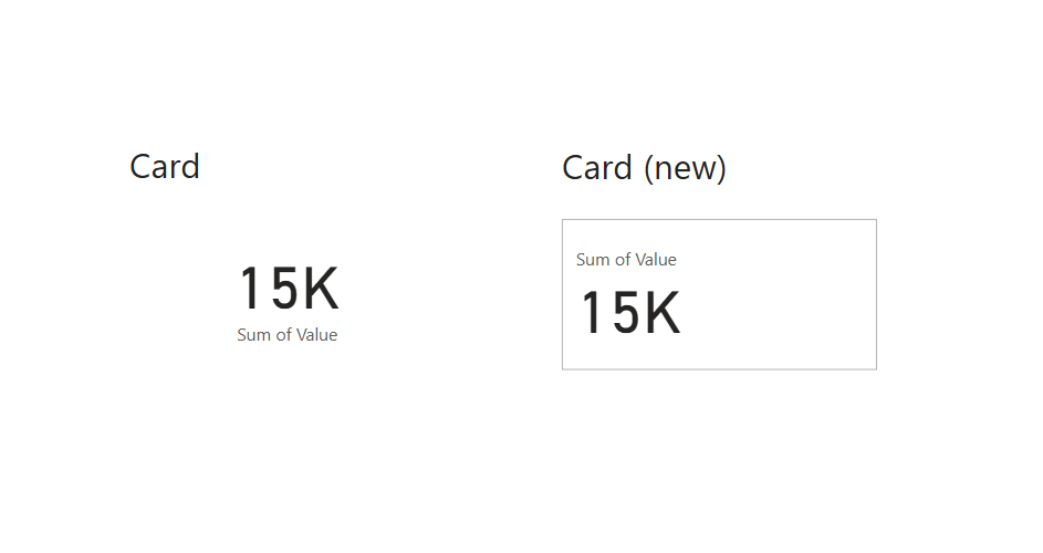 We have two Card visuals added to our canvas, the original one that has been in (and is still in) Power BI for years and year on the left and the new one on the right.