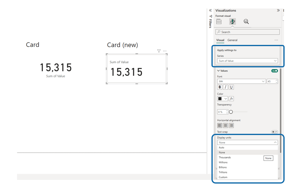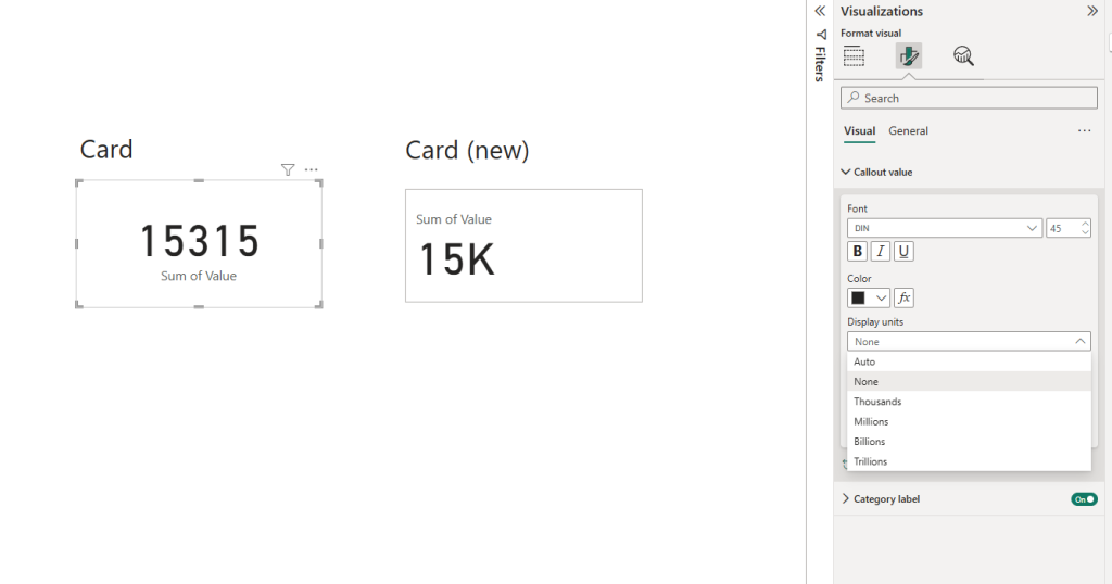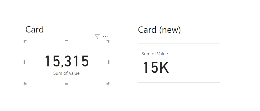 Let’s bring our Value column to both of our card visuals to have the sum of our value column appear in both. By default, Power BI puts a “K” display unit as our sum is in the 1000s.