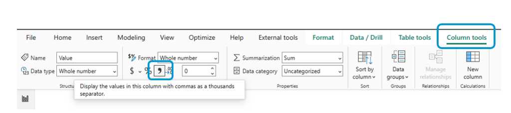 Let’s add some by selecting our Values column in our Data Pane, which will open up a “Column Tools” ribbon up at the top of Power BI.