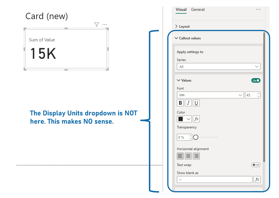 Okay, now that that is done, let’s change the Display Unit on the new Card visual. Select that visual, to into Visual Formatting, open up the Callout values section, just like we did before and find the Display units dropdown…