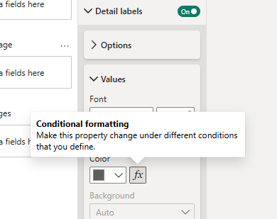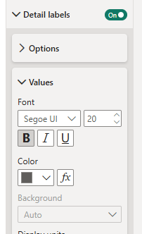 We need to go into our Detail labels section and open up the Values options, but the option to select a series isn’t there. Thanks for nothing, Microsoft. It only gives us the option of selecting ONE color for all labels.