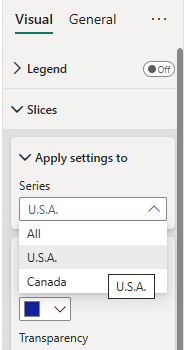 To adjust colors of our pie slices, we can go into the Visual Formatting options in our Visualization Pane, open up the Slices section, select the series we want to change the color of, and just pick a color. Easy-peasy.