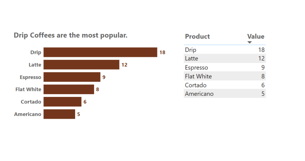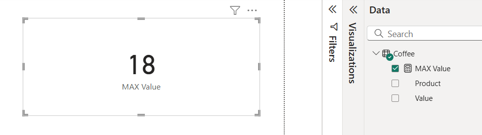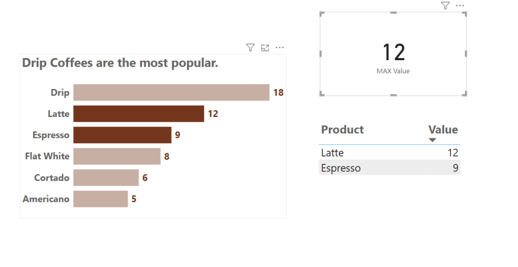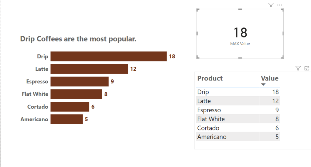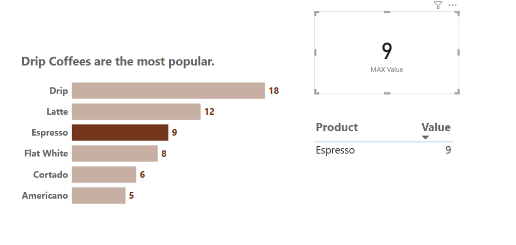 Now, it’s fairly evident from both our bar chart and our table that Drip Coffee has the highest value. We can see that 18 is the highest value in our data, but sometimes we need to isolate that value. Maybe we need it for another DAX calculation, or maybe we just want to show it somewhere in our report.